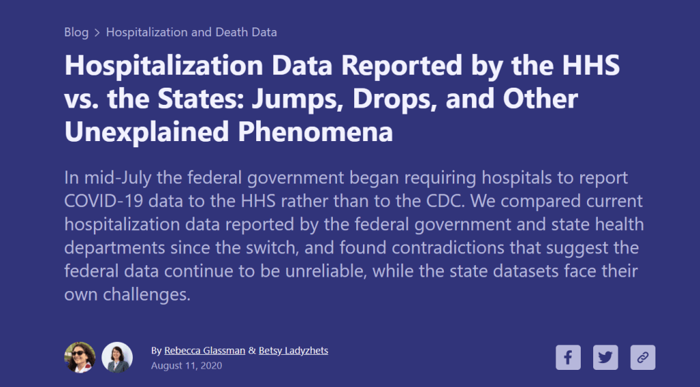 Posted on August 11, 2020July 12, 2021 by Betsy Ladyzhets Hospitalization Data Reported by the HHS vs. the States: Jumps, Drops, and Other Unexplained Phenomena Read the full article on the COVID Tracking Project’s blog (published August 11, 2020). Coauthored with Rebecca Glassman. Related