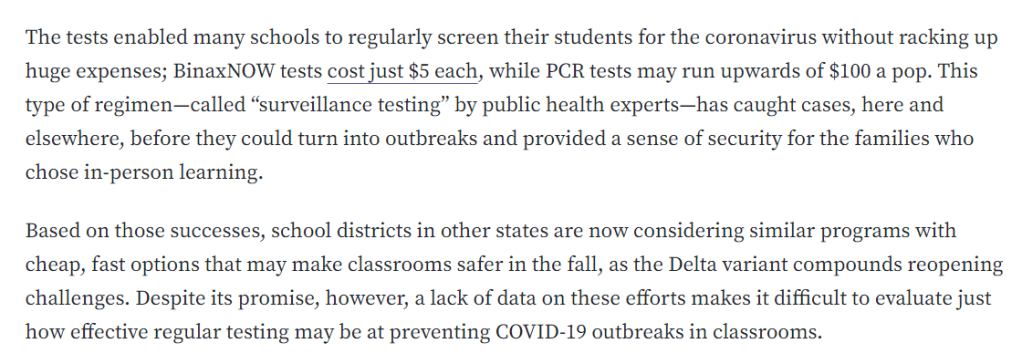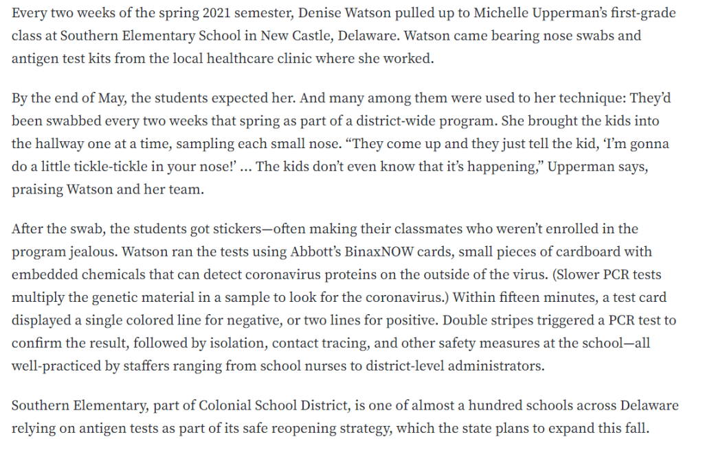 Posted on August 18, 2021May 2, 2023 by Betsy Ladyzhets Inside the Delaware schools that deployed rapid COVID tests to protect kids Read the full story at Popular Science, published August 18, 2021. Related