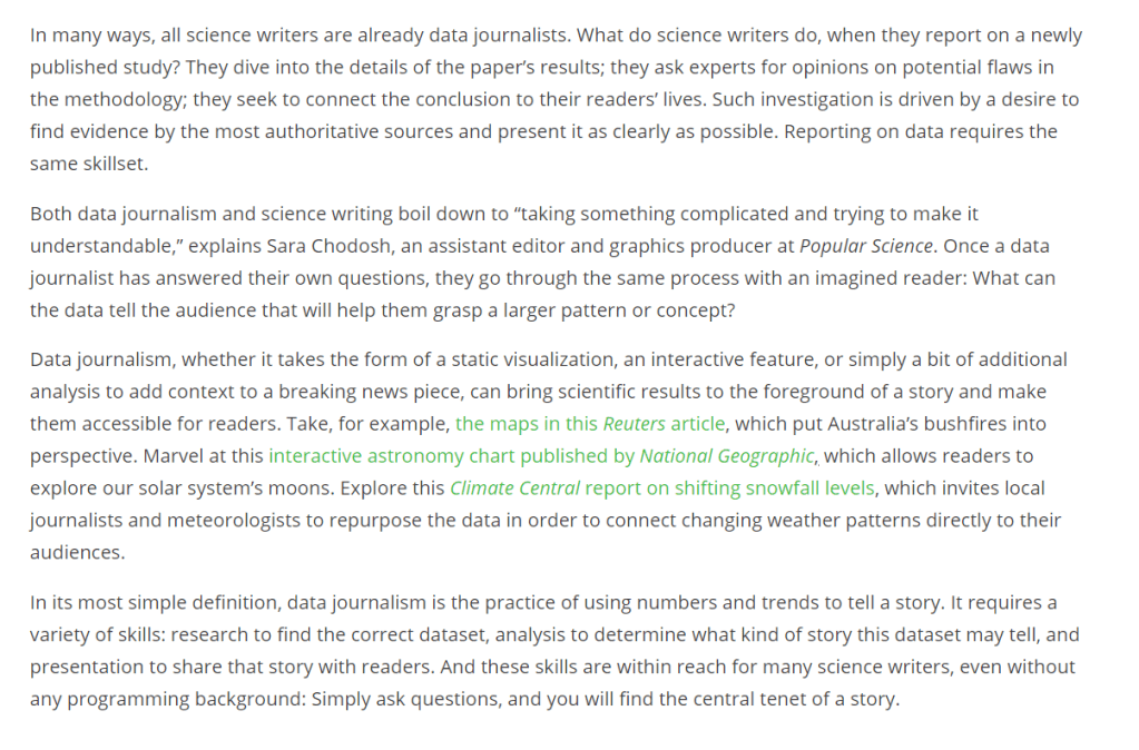 Posted on July 28, 2020July 12, 2021 by Betsy Ladyzhets Interrogating Data: A Science Writer’s Guide to Data Journalism Read the full story on The Open Notebook (published July 28, 2020). Related
