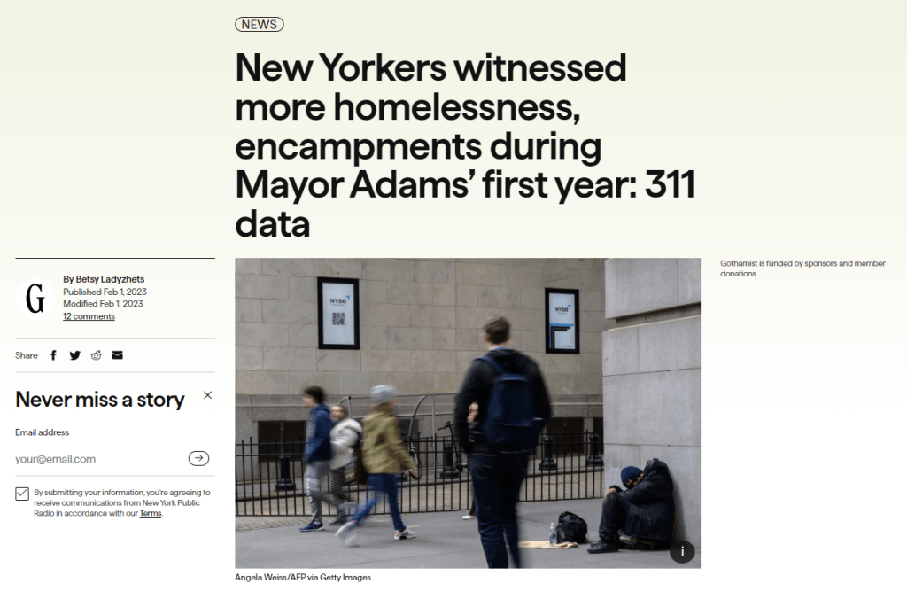 Posted on February 1, 2023May 2, 2023 by Betsy Ladyzhets New Yorkers witnessed more homelessness, encampments during Mayor Adams’ first year: 311 data Read the full story at Gothamist, published February 1, 2023. Betsy also appeared on WNYC to discuss the story. Related