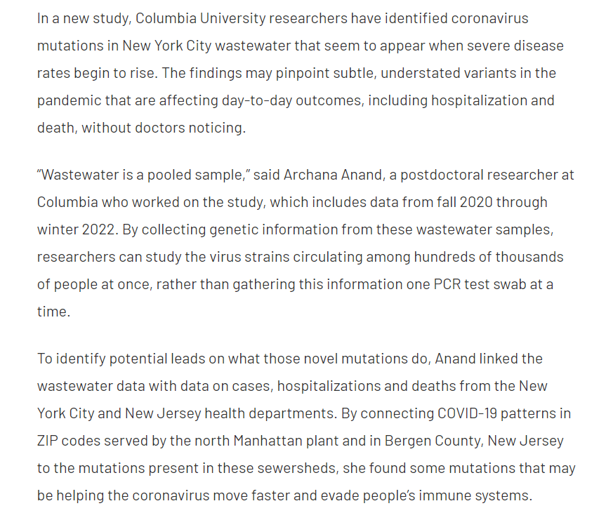 Posted on August 4, 2022May 2, 2023 by Betsy Ladyzhets NYC wastewater shows link between cryptic COVID variants and worse phases of the pandemic Read the full story at Gothamist, published August 4, 2022. It’s also available at MuckRock. Related