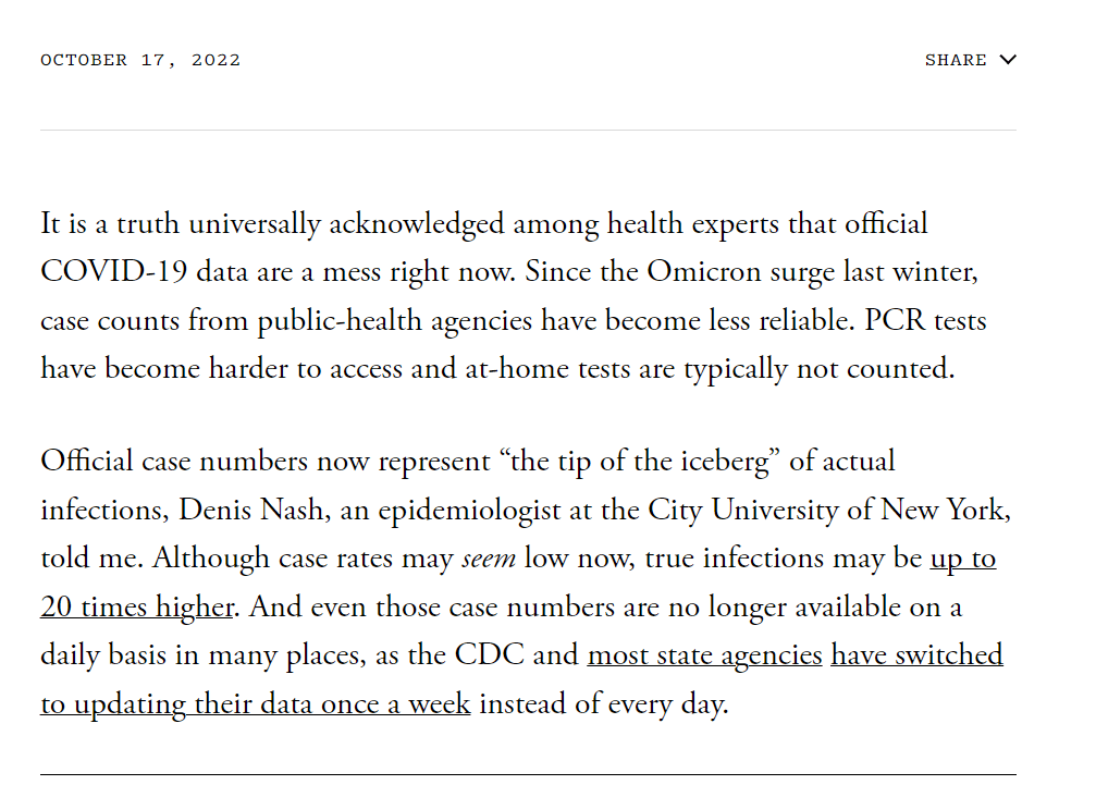 Posted on October 17, 2022December 30, 2022 by Betsy Ladyzhets The COVID Data That Are Actually Useful Now Read the full story at The Atlantic, published October 17, 2022. Related