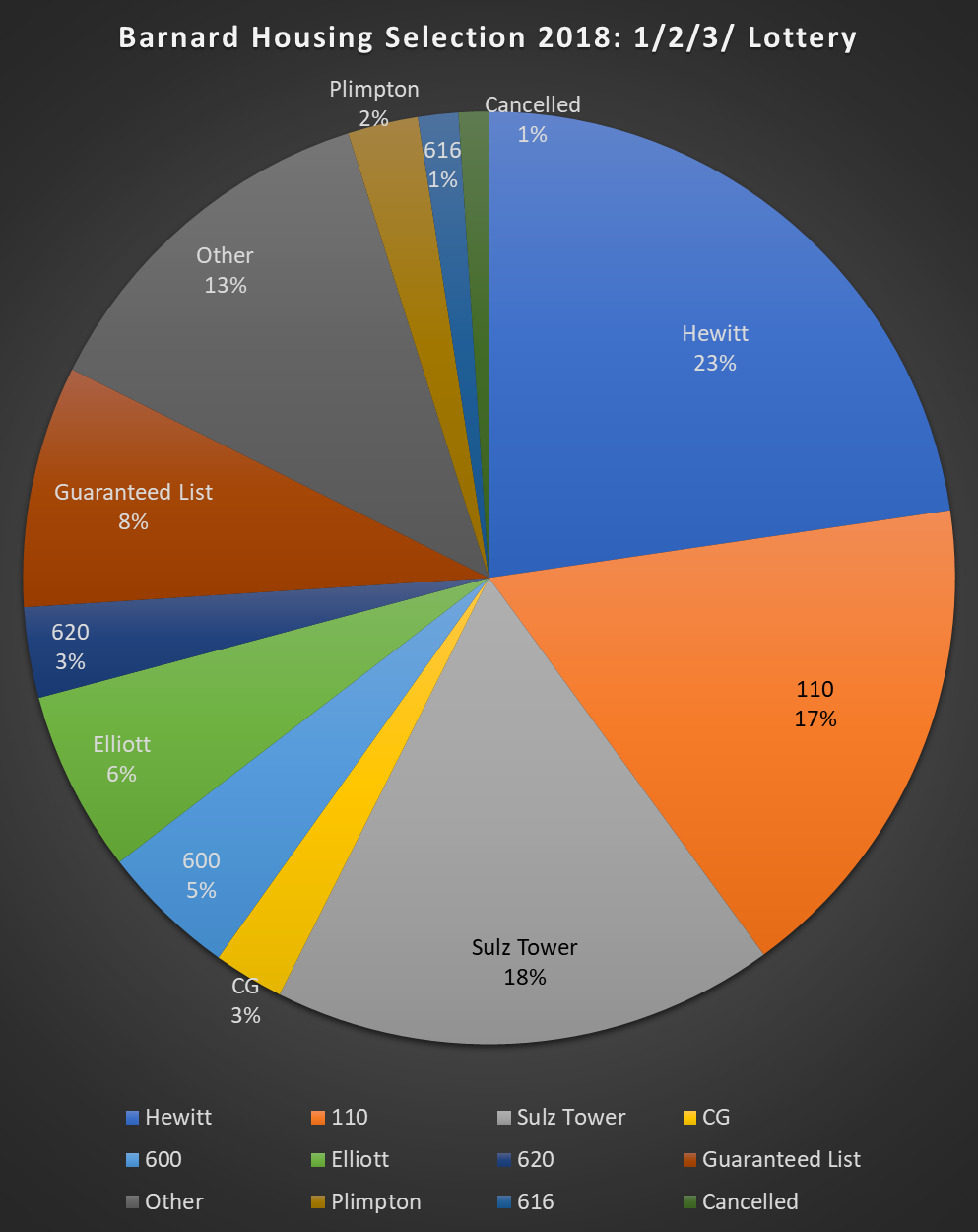 This new system immediately became a cause for concern, particularly among rising seniors who felt as though they had been cheated out of their chance to secure Barnard’s best suites. But how much did this new system actually affect students’ choices of rooms? What can be learned from this year’s selection process to improve future rounds of housing selection? In order to answer these questions, I spoke to Mia Lindheimer, BC ’19, the current SGA Representative for Campus Affairs (and a former Bwogger!), who has worked closely in liaising between students and Matt Kingston, Barnard’s Associate Director for Housing Operations, throughout the new process, and also examined the data available from Res Life on where each group in the Barnard lottery picked.