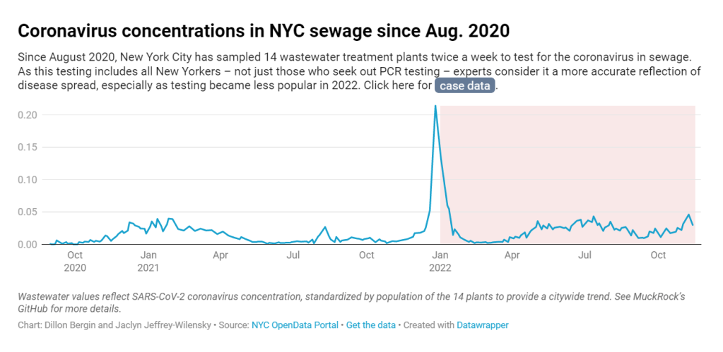 Posted on December 15, 2022May 2, 2023 by Betsy Ladyzhets Wastewater can predict COVID-19 surges, but NYC’s data remains hard to find Read the full story at Gothamist, published December 15, 2022. It’s also available at MuckRock, and Betsy appeared on a WNYC segment discussing the story. I got the scoop on NYC's wastewater surveillance program: the city health & environmental protection agencies have been testing for COVID-19 in our sewers since early 2020, but transparency issues abound.for @MuckRock & @Gothamist/@WNYC: (1/5) https://t.co/ZW7gooKKxR pic.twitter.com/oSbTJHcop0— betsy ladyzhets 📊 (@betsyladyzhets) December 15, 2022 Related