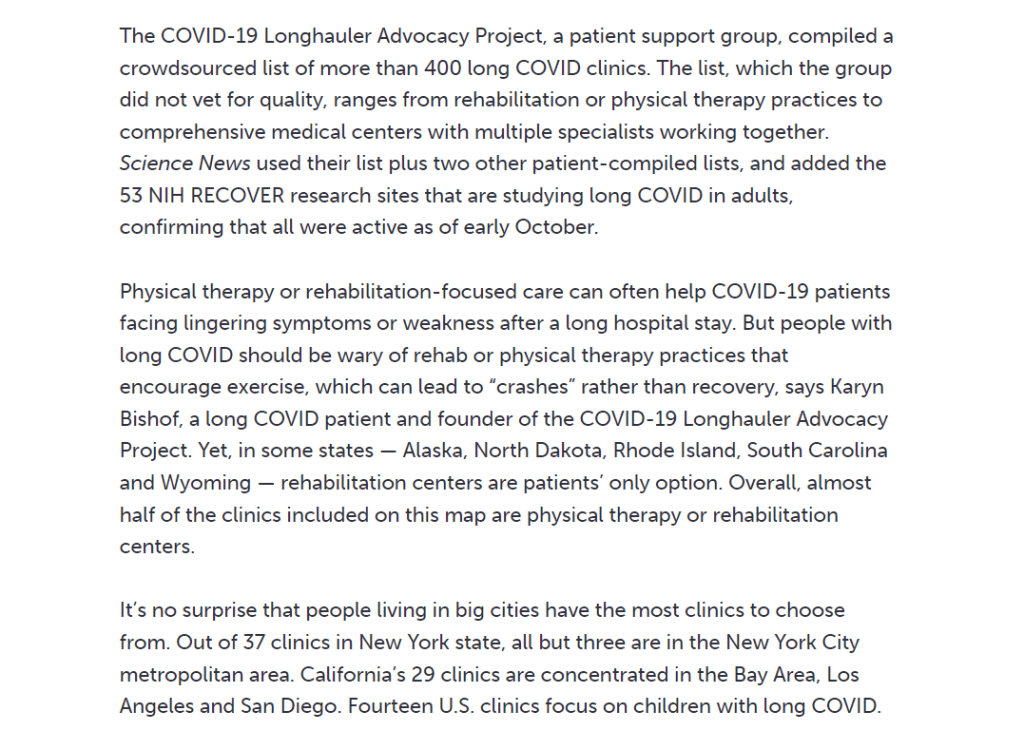 Posted on November 3, 2022December 30, 2022 by Betsy Ladyzhets Where are the long COVID clinics? Read the full story (and check out the interactive map) at Science News, published November 3, 2022. Related